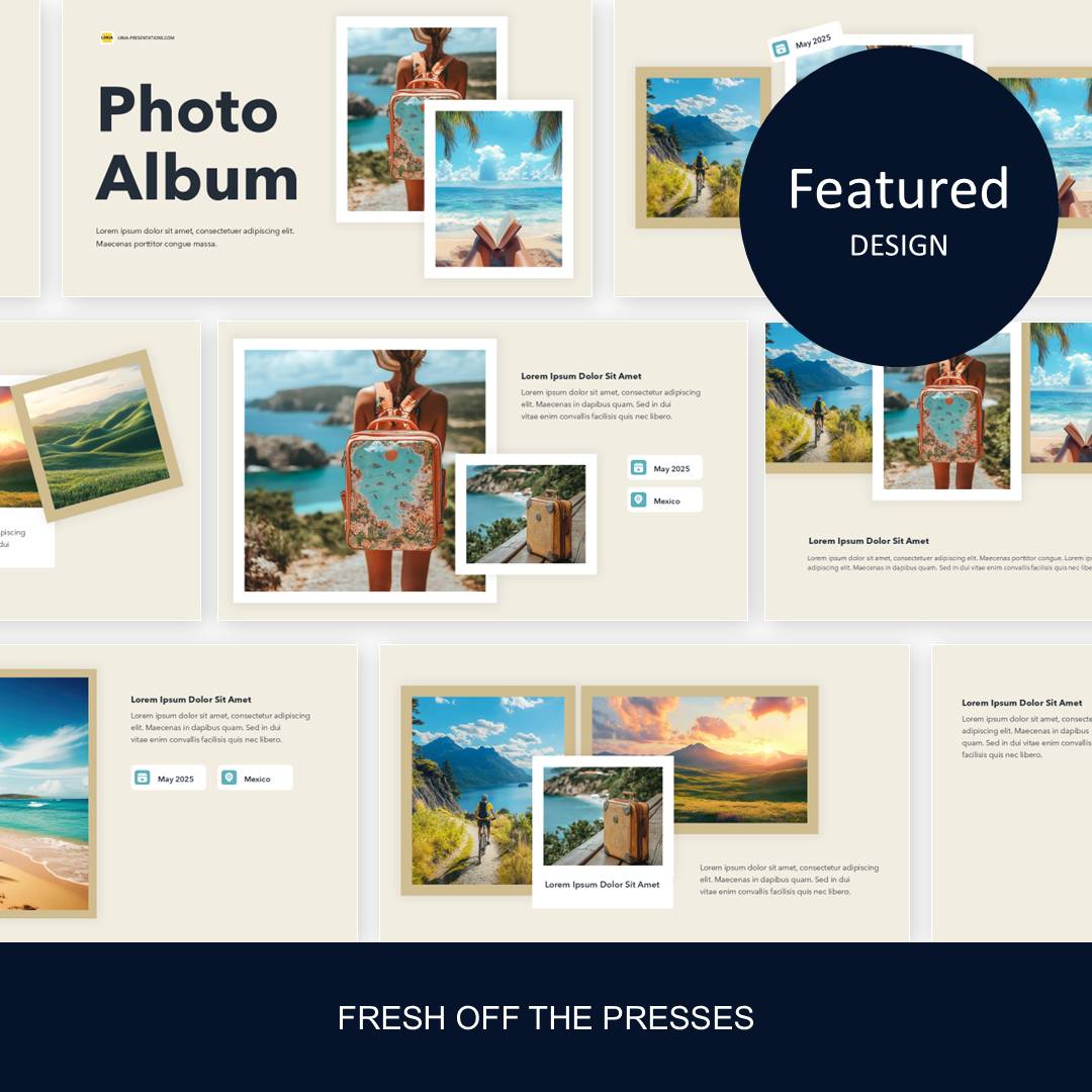 The Photo Album PowerPoint Template is perfect for all kinds of celebrations: trips, weddings, birthdays, a...