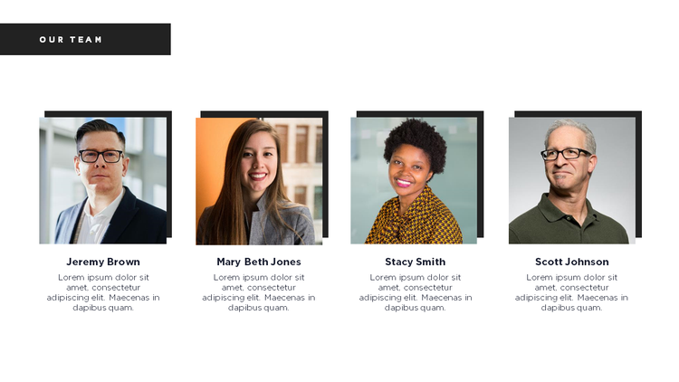 You can use these modern team slides for many types of team introductions. Whether you're a project manager or consultant showing who's working on a project, or a company leader making a pitch deck who needs to show the high level of knowledge on your team - these professionally designed slides will help you achieve that. They'll help you quickly show who’s involved in the work and why they’re qualified.